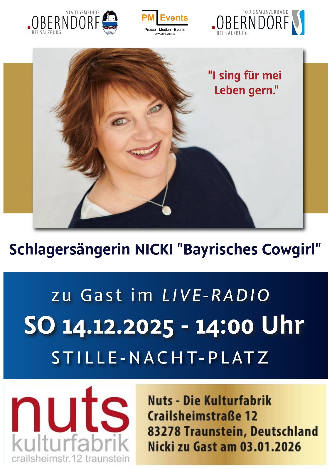 Am 14.12.25 sendet Radio PM Events live vom Weihnachtsmarkt in Oberndorf bei Salzburg. Dieter Gerauer führt sie durch einen weihnachtlichen Nachmittag mit Studiogästen und Livemusik. Livegast in unserem "rollenden Studio" ist Nicki das "bayerische Cowgirl".